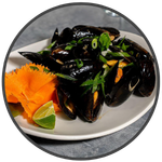 Whole mussels pan-fried with garlic, soy sauce, oyster sauce, spring onion and coriander.